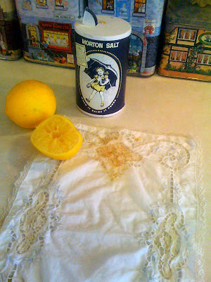 So I took my linens and soaked them in the sink and then gently wrung out the excess water, and then I took a half meyer lemon and sprinkled a lot of salt on it and scrubbed at the stain until it was soaked with the lemon juice salt concentration. I left the treated linens outside on the grass on a medium sunny day for about 3 hours until they were dried through and then brought them in rinsed to get rid of the lemon juice and salt.